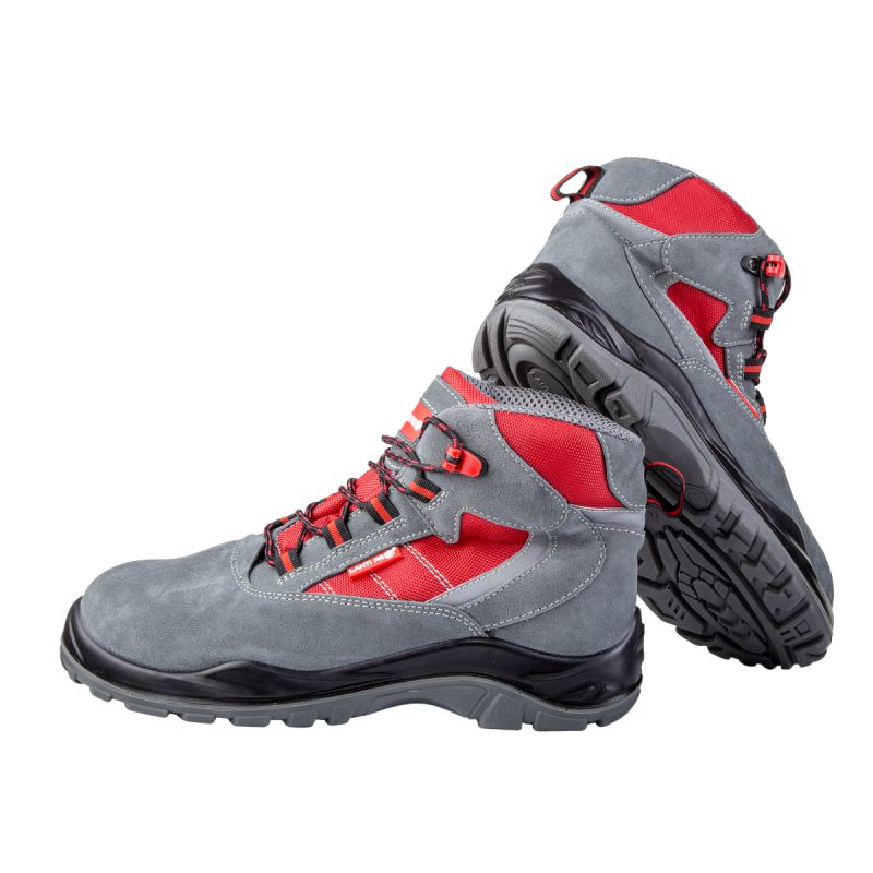 • MATERIAL: Parte superioară: piele şi ţesătură tip Oxford. Căptușeală: material textil. Branţ detaşabil. Talpă: poliuretan cu dublă densitate, cu proprietăți anti-alunecare (pe suprafețe din oțel și ceramică), rezistent la uleiuri, nervuri protectoare profunde și călcâi parabolic care asigură o stabilitate ridicată a încălțămintei și confortul la mers.