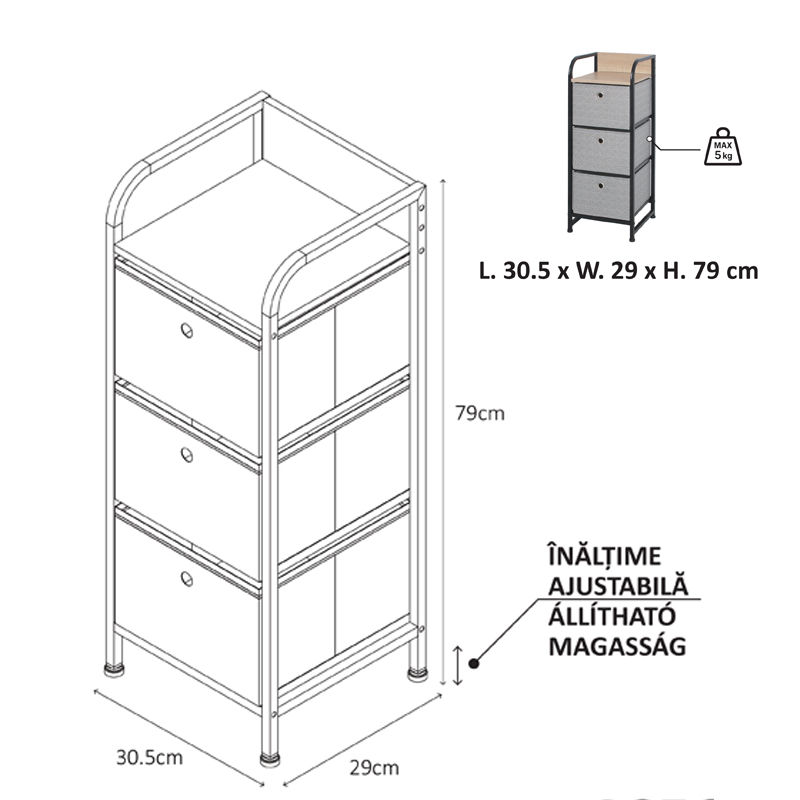 COMODA 3 SERTARE TEXTILE / 30X29X79CM - GRI/NEGRU