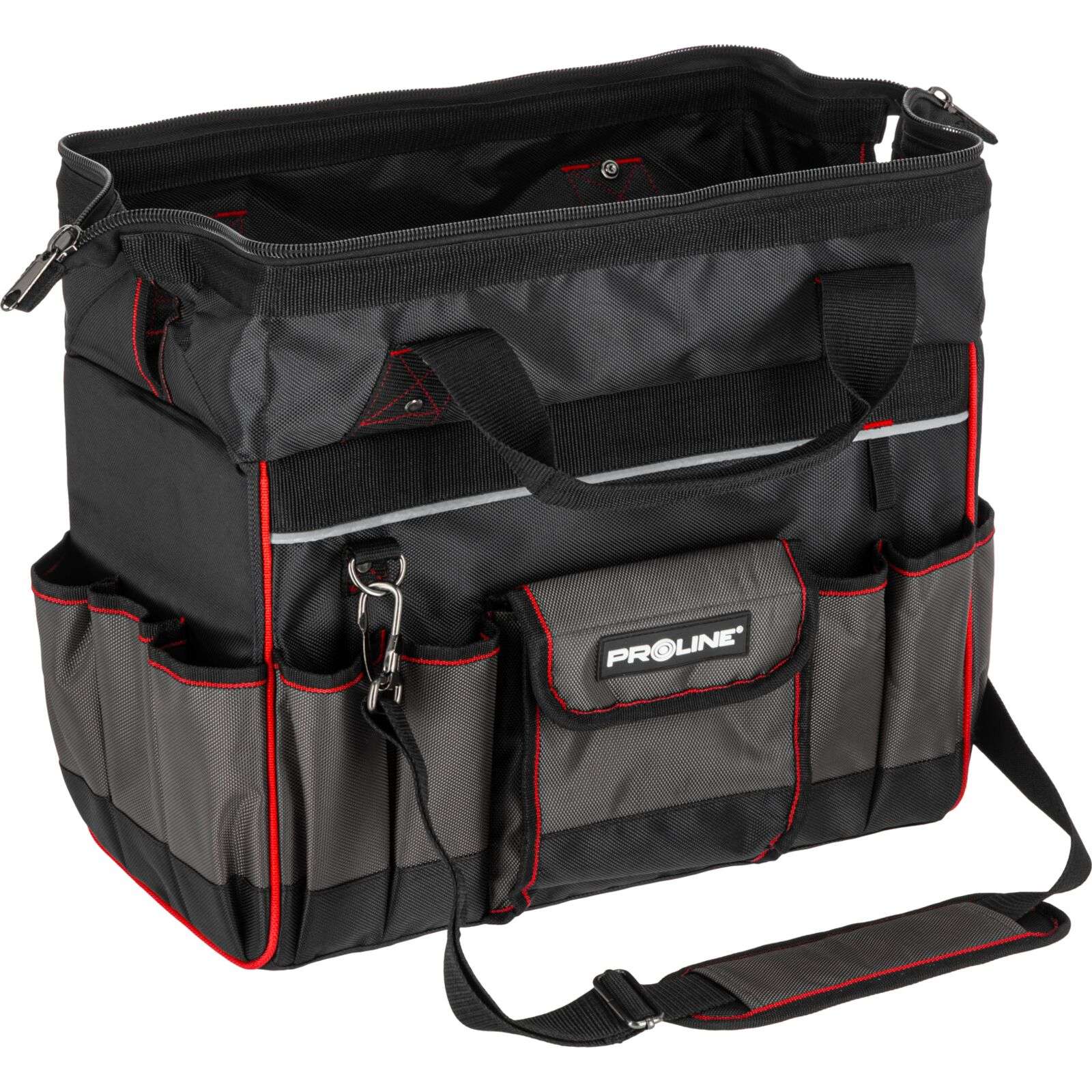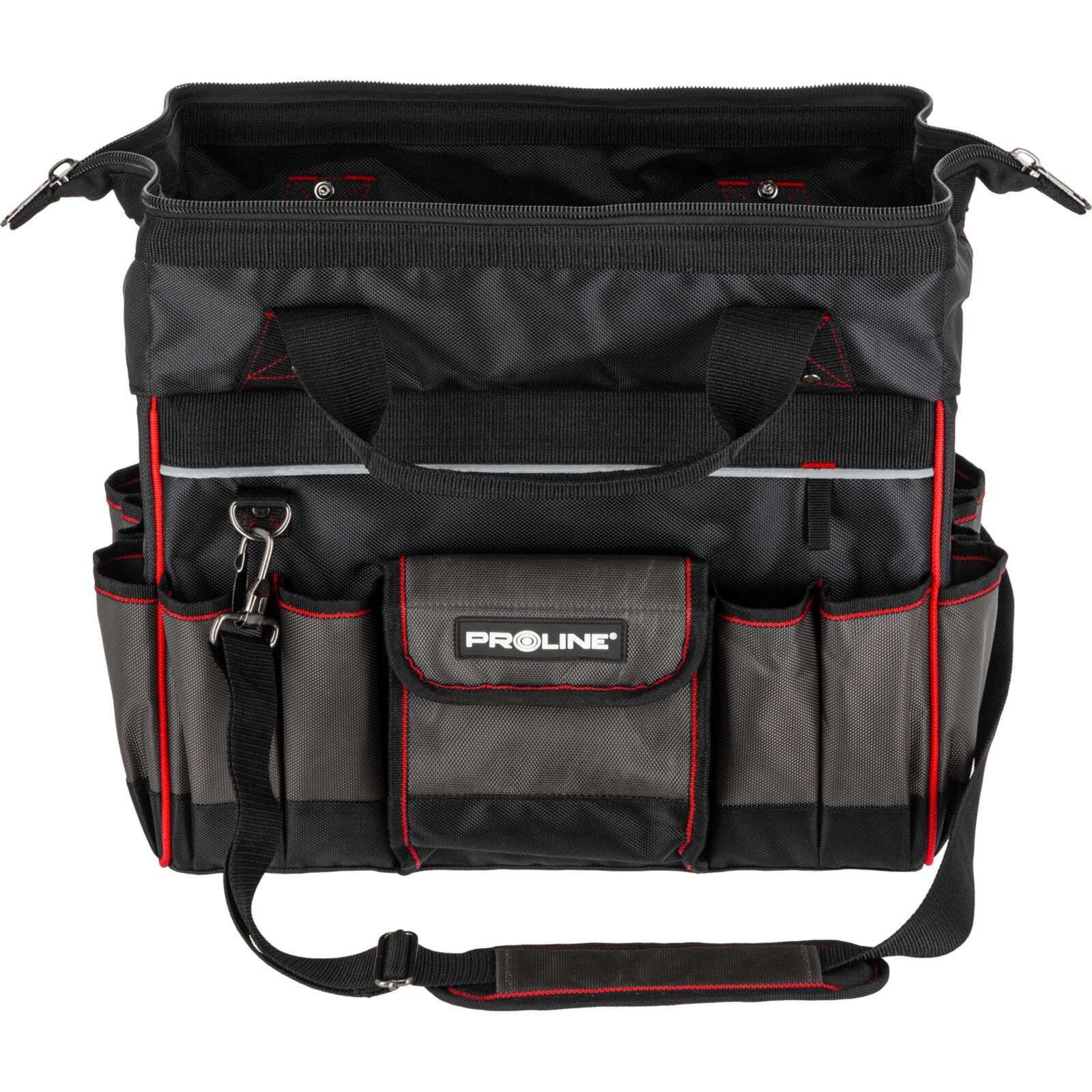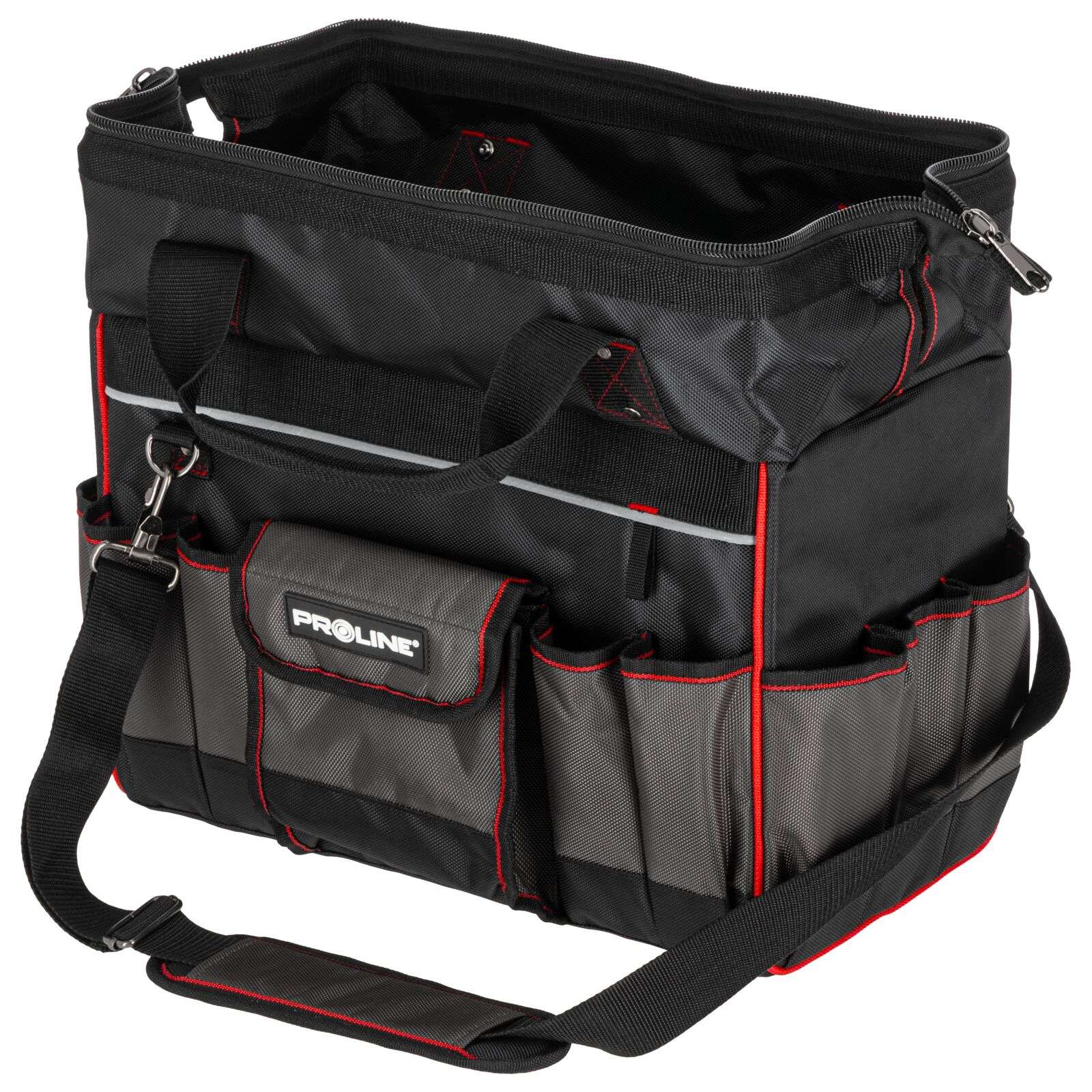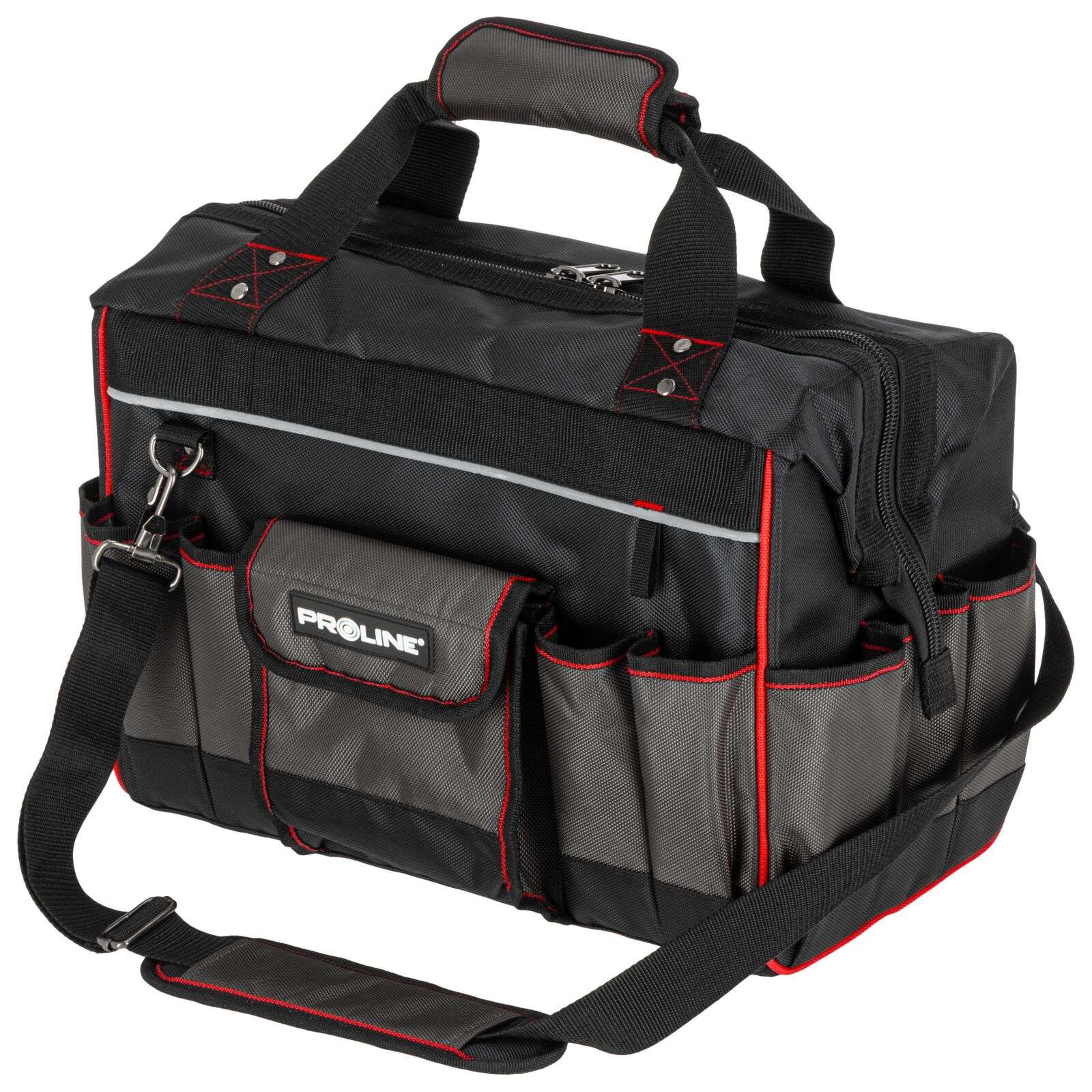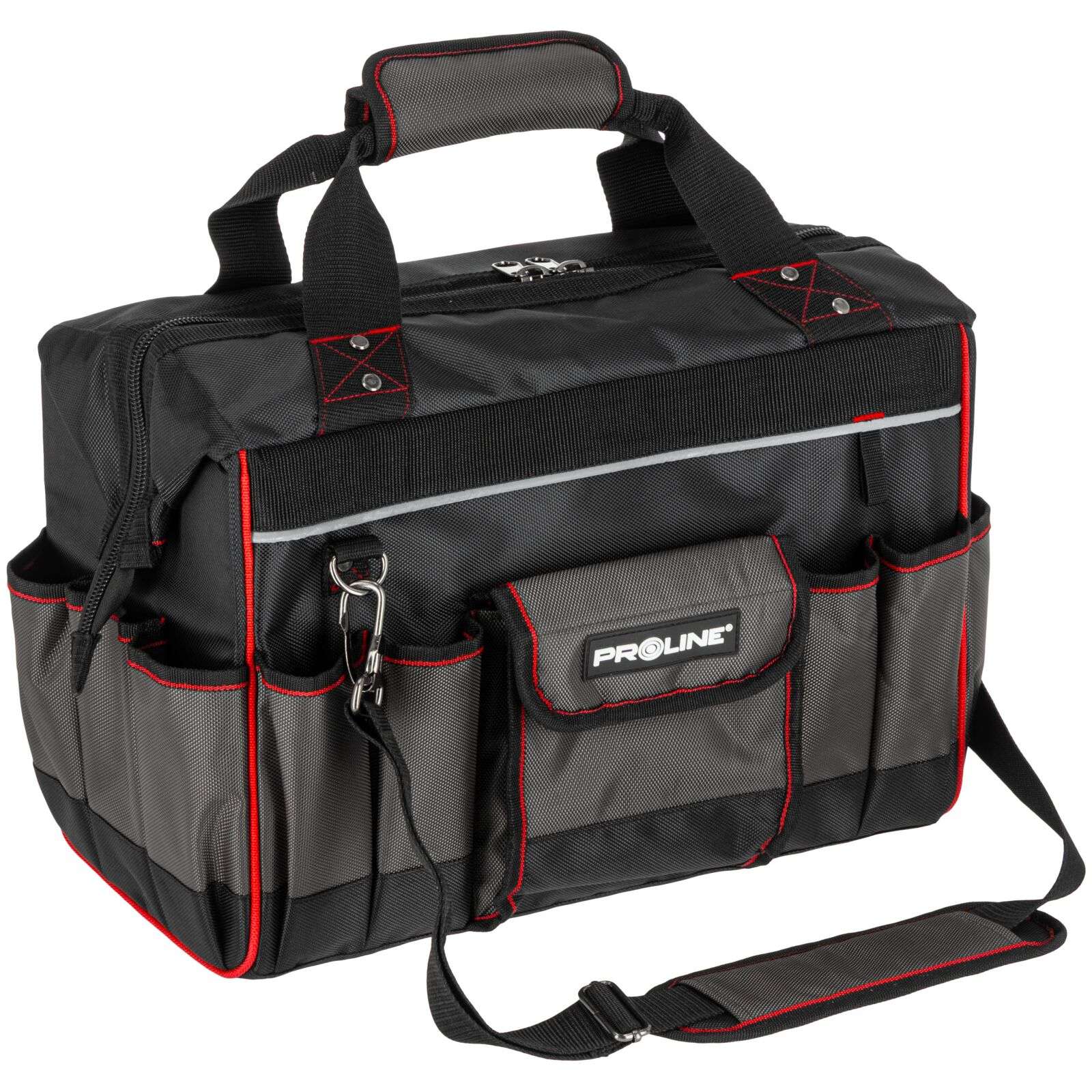DescriereGeanta de scule Proline 62153 reprezintă o soluție practică și rezistentă, concepută special pentru profesioniștii care au nevoie de o organizare fiabilă a uneltelor și de confort în timpul transportului. Se potrivește excelent pentru montori, instalatori, tehnicieni de service sau specialiști în teren. Geanta este fabricată din poliester Oxford 1680D rezistent la deteriorări, ceea ce garantează o durată lungă de viață chiar și la utilizare intensivă. Construcția rigidizată protejează conținutul și facilitează menținerea ordinii în interior, iar numeroasele buzunare permit aranjarea comodă a uneltelor și accesoriilor. Mânerul întărit cu nituri și mânerul moale închis cu velcro asigură un transport confortabil. În plus, geanta este echipată cu un bretea reglabilă și detașabilă pentru umăr, care crește confortul la transport pe distanțe mai lungi. Fermuarul dublu permite acces rapid și ușor la conținut, iar elementele reflectorizante îmbunătățesc siguranța la lucru. Principalele caracteristici ale produsului: • Material: Poliester Oxford 1680D Produse similare