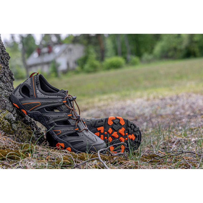 • Material: partea superioară: PU și țesătură de plasă, șireturi elastice reglabile cu o clemă. Branț: detașabil (branțuri au inserate o pernă moale si elastic, suprafața conturată sprijină și stabilizează piciorul, designul branțurilor reduce oboseala și crește confortul în timpul mersului pe jos). Căptușală: material textil. Talpa este confecționată din cauciuc, cu flexibilitate ridicată.
