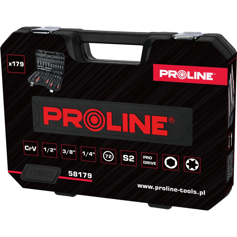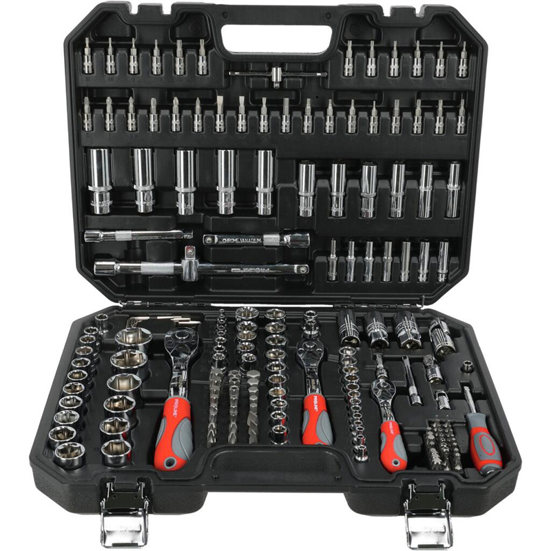• Oţel aliaj crom-vanadiu, suprafaţă cromată şi făţuită • Livrat într-o cutie de plastic • Sistem de montare și demontare rapidă a balamalelor cutiei (posibilitatea de a depozita seturile sub formă de tăvi pentru unelte, de exemplu, în sertarele atelierelor). • Închizătoare metalice • Chei tubulare, trei dimensiuni: 1/2”, 3/8”, 1/4” • Socluri zimțate • Clichet reversibil 1/2“, 1/4“ și 3/8“